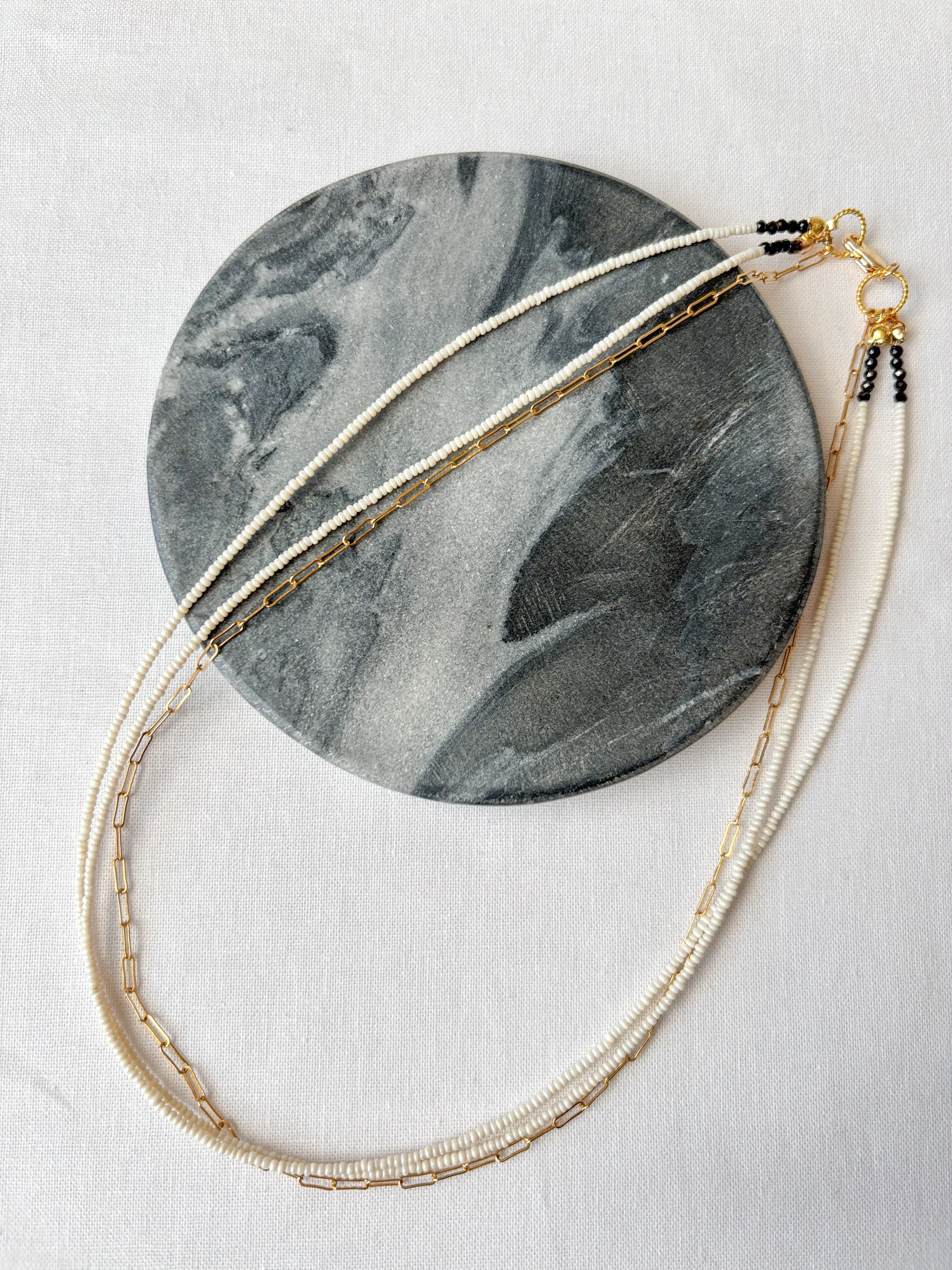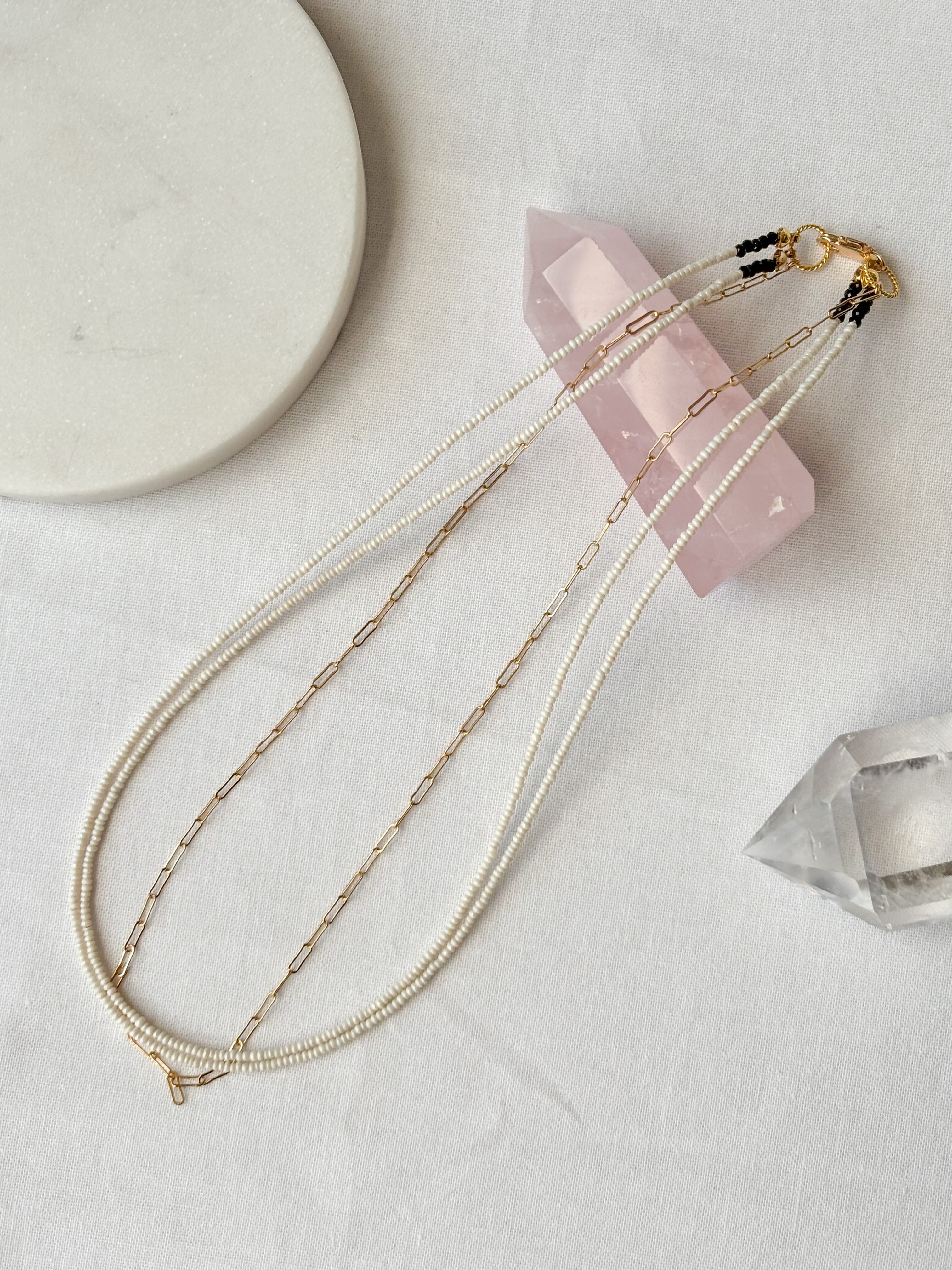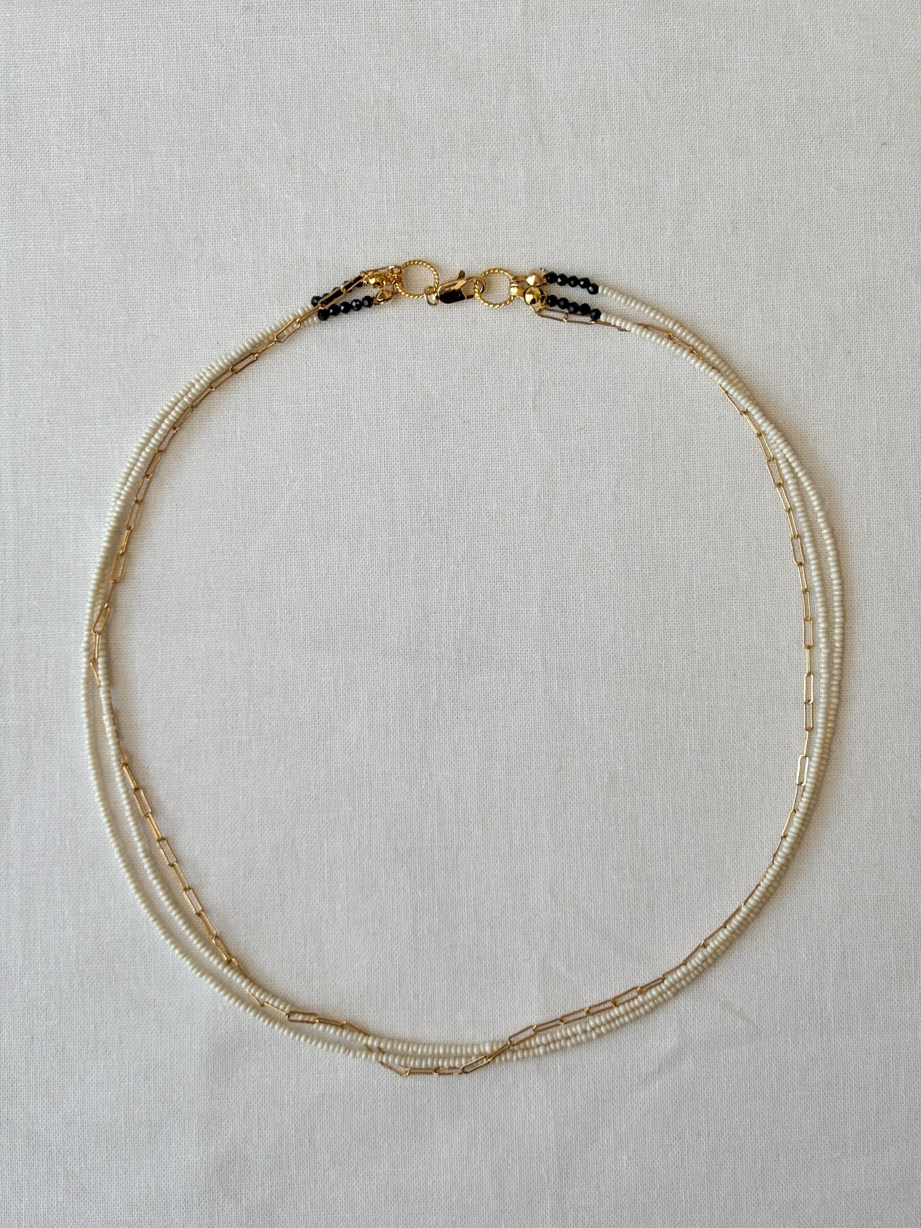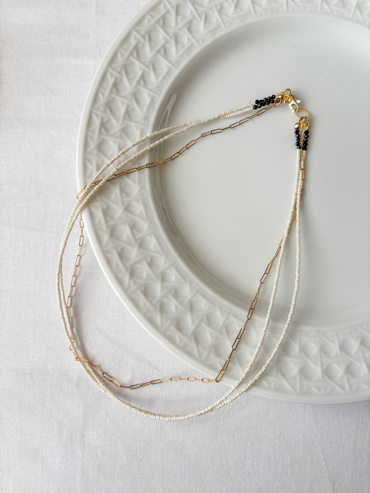 アイボリーがかった、表情のあるビーズが印象的